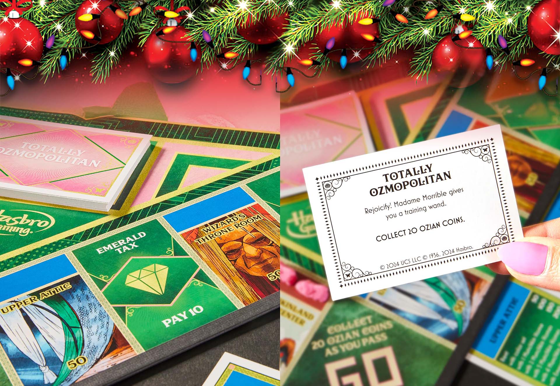 The board features places from the hit musical turned award-winning flick (like the Emerald City) and uses Ozian coins instead of standard cash. Munchkin Homes and Emerald Castles replace houses and hotels, giving players bigger rewards the more they build. The game stays easy to understand for families who've played this classic board game before, but the themed spaces give it personality and charm for fans of Wicked.